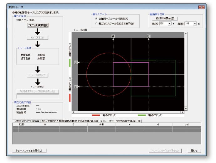 位置決めユニットによるオンライン動作で、各軸がどのような値で動作したかを視覚的に確認できます。