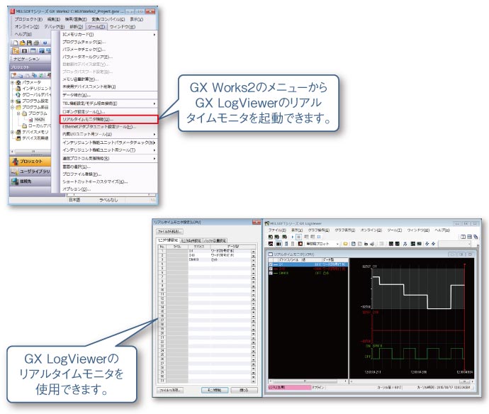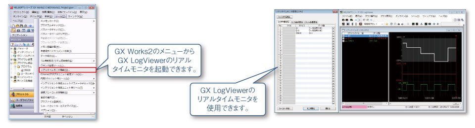GX Works2*2からGX LogViewer*3を起動することで、LCPUのリアルタイムモニタを簡単に使用できます。
