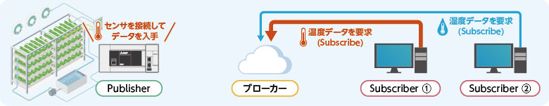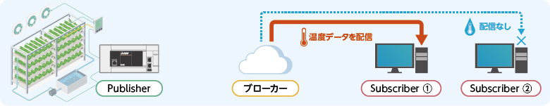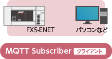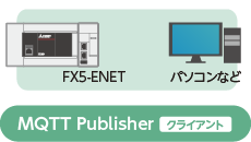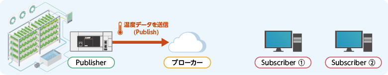 MQTTでは、Publish/Subscribeモデルを採用。FX5-ENETからMQTTブローカーに対して発行(Publish)を行うと、MQTTブローカーは購読(Subscribe)要求を受けているすべての情報受信機器に配信します。