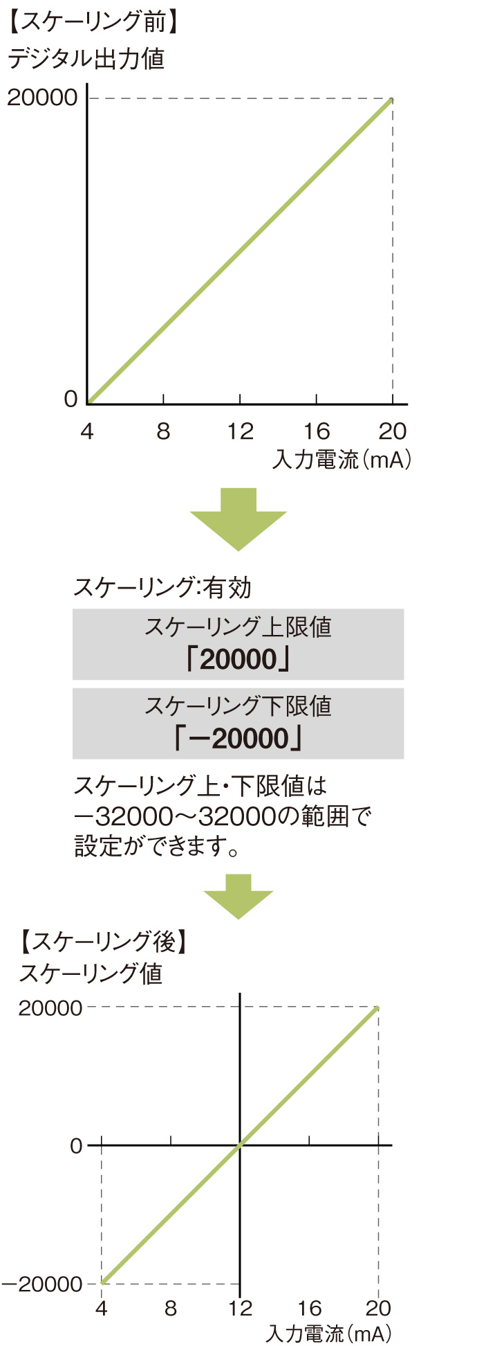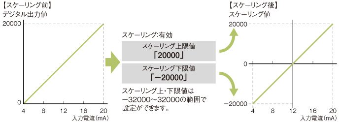 デジタル出力値をプログラムレスで簡単に任意の値へ変換(スケーリング)する機能です。