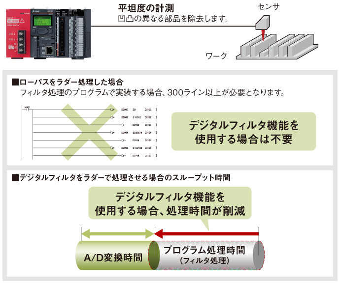ラダーでのフィルタ処理が不要となるため、プログラミング工数を削減できます。
