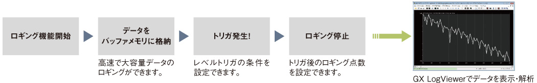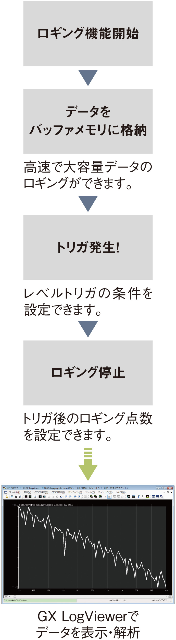 設定した周期でデータを連続して収集し、チャンネルごとに最大10000点のロギングデータを格納できます。ロギングしたデータを使用してデバッグを行ったり、データの変動を定期的に確認できます。