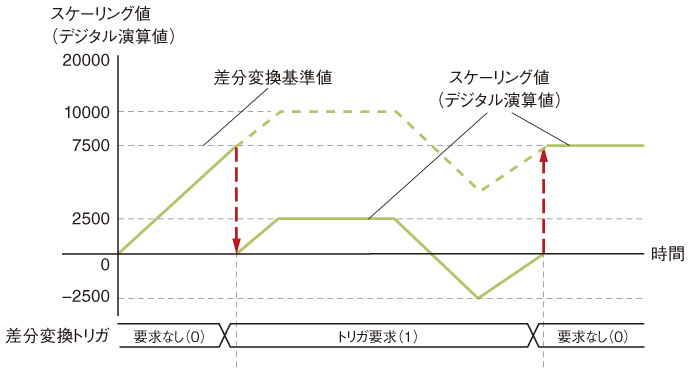 差分変換が開始されると、開始時点でのスケーリング値(デジタル演算値)を差分変換基準値とします。スケーリング値(デジタル演算値)から差分変換基準値を引いた値が、差分変換後のスケーリング値(デジタル演算値)として格納されます。