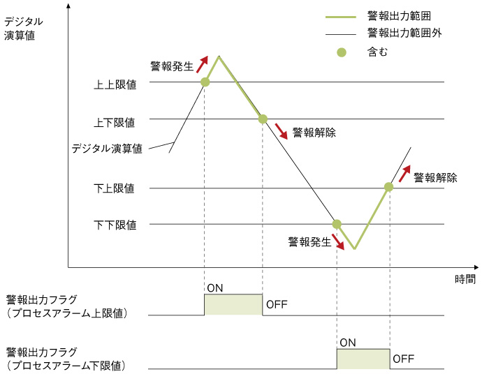 デジタル演算値があらかじめ設定された範囲に入った場合に警報を出力します。
