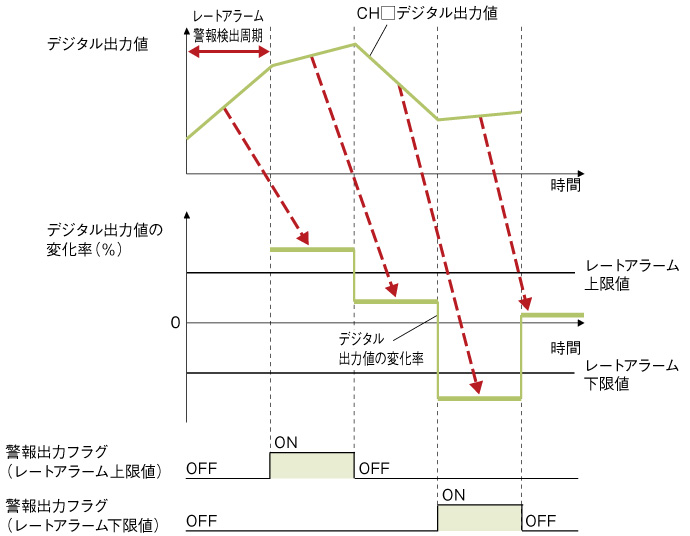 デジタル出力値の変化率がレートアラーム上限値以上に大きな変化率を示した場合、またはレートアラーム下限値以下の小さな変化率を示した場合に警報を出力します。