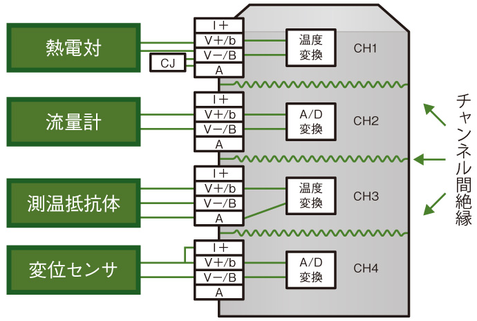 チャンネル間が絶縁されているため、各チャンネルに接続するセンサ間のノイズ回り込みを防ぎ、安定した測定ができます。