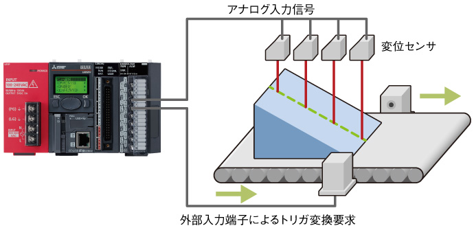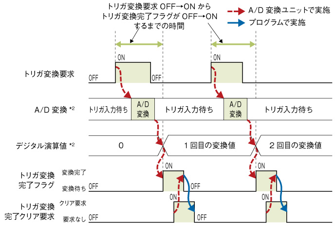 トリガ変換要求の入力タイミングに合わせて、A/D変換できます。使い勝手や操作性の向上、プログラミング性の向上が図れます。トリガ変換要求には「外部トリガ変換要求(外部入力端子)」、または「内部トリガ変換要求(バッファメモリ)」の2種類があります。