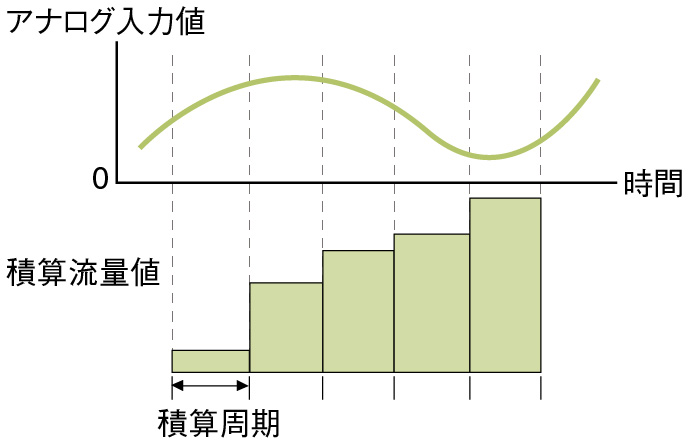 流量計などからのアナログ入力値(電圧または電流)をA/D変換し、積算周期ごとにスケーリング値(デジタル演算値)を積算できます。本機能では、スケーリング値(デジタル演算値)を瞬時流量として積算処理を行います。