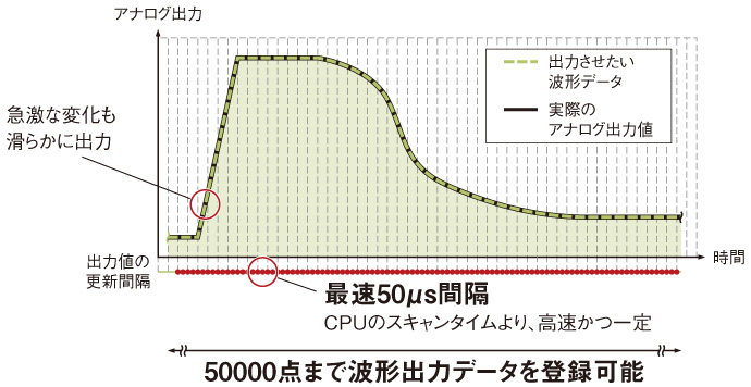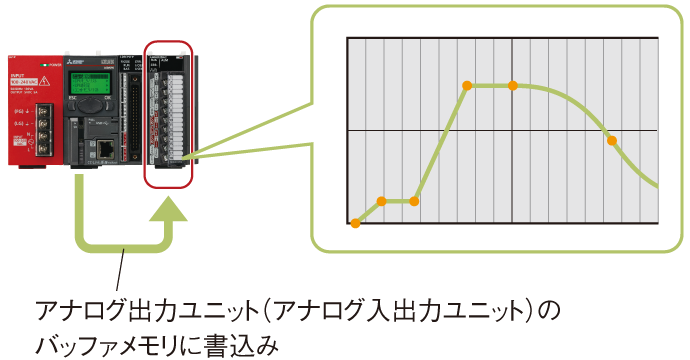あらかじめ用意した波形データをアナログ出力ユニットに取り込み、設定した変換周期でアナログ出力できる機能です。