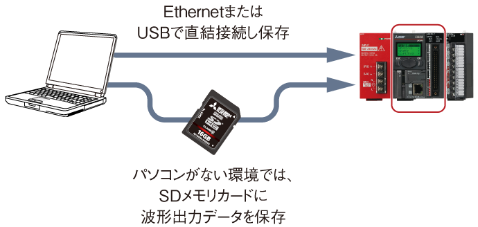 ② 波形出力データをCPUユニットのファイルレジスタ(またはSDメモリカード)に保存