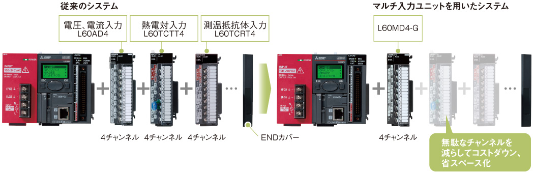 1ユニットで「電圧」・「電流」・「微小電圧」・「熱電対」・「測温抵抗体」に対応<sup>L60MD4-G</sup>