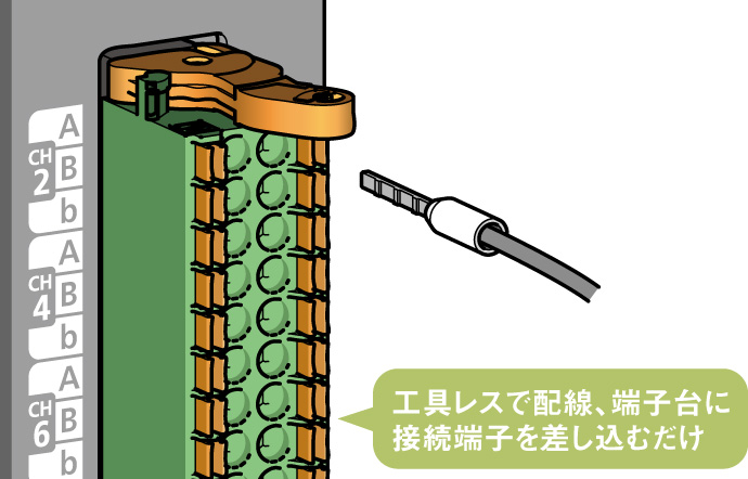 スプリングクランプ端子台により、ネジ締め作業の手間と工数を削減することができます。プッシュインタイプのため、工具なしで配線が可能です。また、ネジの締め直しなどの定期メンテナンスは不要になります。