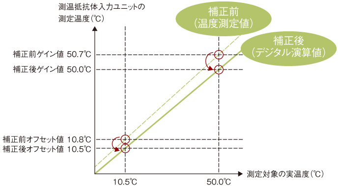 温度測定値が10.8~50.7(℃)のとき、デジタル演算値が10.5~50.0(℃)になるよう補正され、測温抵抗体に入力している実温度に近い温度測定値が得られます