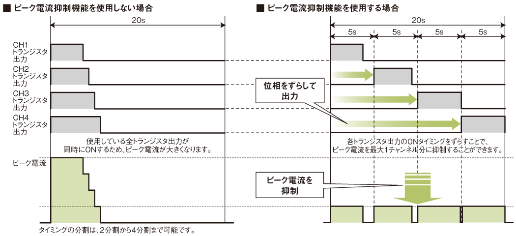 ピーク電流抑制機能を使用すると、各チャンネルの上限出力リミッタ値が自動で変更され、トランジスタ出力のタイミングを分割*1されます。これにより、ピーク電流が抑制されます。