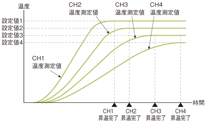 同時に昇温するチャンネルのグループを設定することにより、最大2グループで別々に同時昇温を行います。