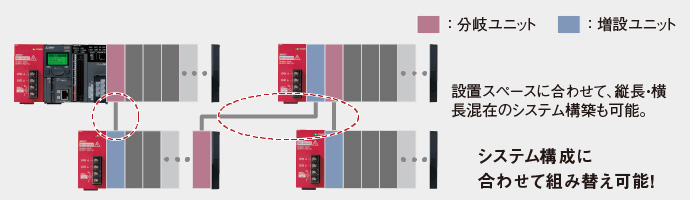 分岐/増設ユニットを使用することにより、増設3ブロックで最大40ユニット*1装着できます。