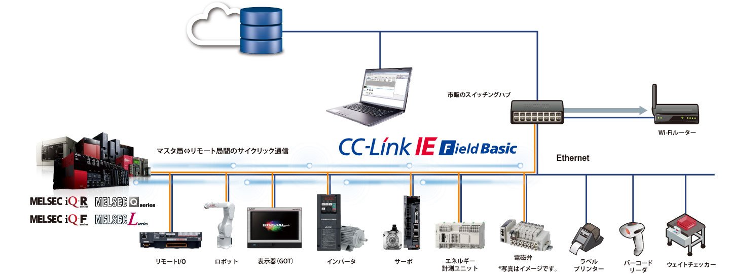 CC-Link IEフィールドネットワーク Basicはソフトウェアのみの実装でサイクリック通信を実現します。入手が容易な市販のスイッチングハブ、ケーブルを使用可能なため、簡単かつ低コストでシステムを構築できます。その開発容易性から当社製品はもちろん、他メーカーも接続可能製品の発売を予定しています。今までコスト面などで対応が難しかった製品のネットワーク化により、つながる幅の更なる拡大が期待されます。