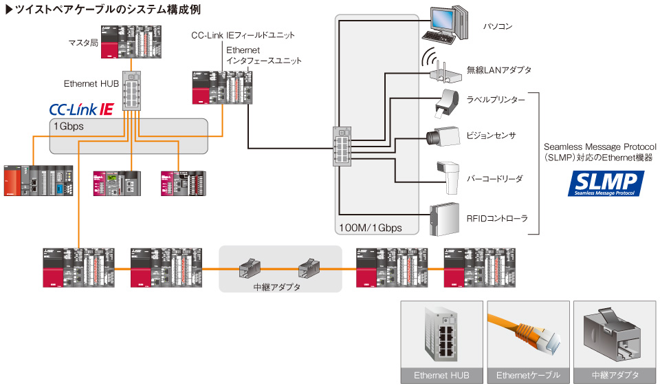 Ethernetインタフェースユニットを経由すれば、Seamless Message Protocol(SLMP)に対応したEthernet機器をCC-Link IEフィールドネットワークに接続できます。ビジョンセンサやRFIDコントローラなど、豊富な機器を活用できます。
