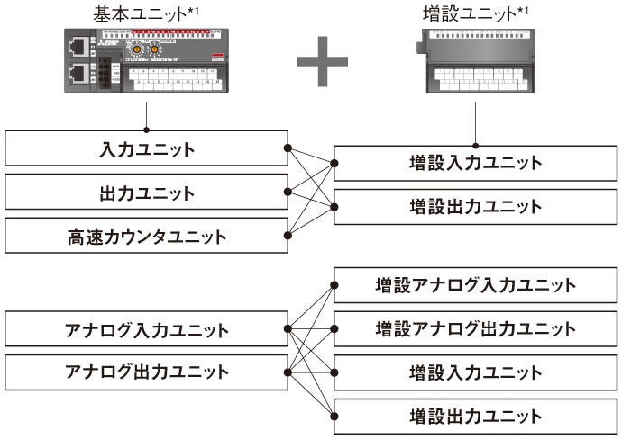 入出力、アナログ入出力、高速カウンタなどの基本ユニットに増設ユニットを連結して、入出力/アナログ入出力の点数を簡単に追加できます。