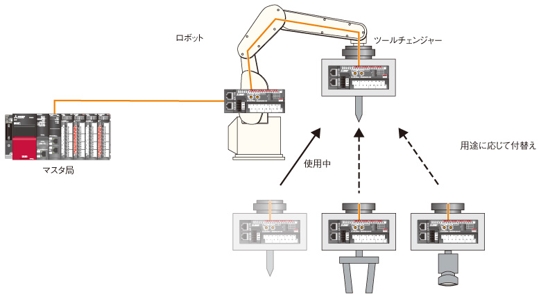 CC-Link IEフィールドネットワークの通信を切り離した状態から再接続した場合に、ファストリンクアップ機能に対応したリモートユニット*1を使用することですばやく復列できます。交換機構(ツールチェンジャー)などを使用したシステムにおいて、起動時間を短縮することで、タクトタイムを向上できます。