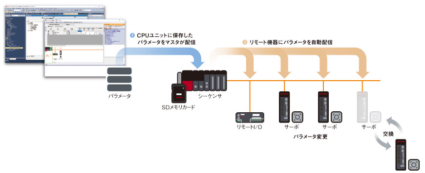 電源ON時や復列時に、マスタがCPUユニットに保存したパラメータをリモート機器へ自動で配信します。そのため、リモート機器を交換した後でも、個別のパラメータ書込みは不要で、スムーズに交換できます。