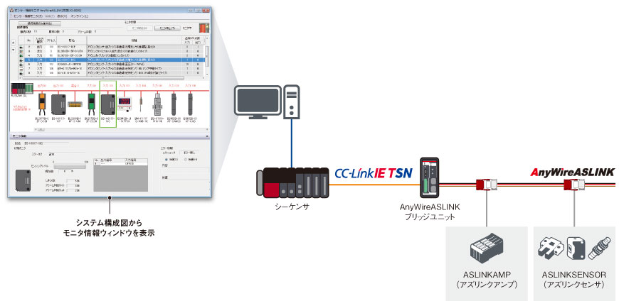 AnyWireASLINKブリッジユニットを使用することで、CC-Link IE TSNにAnyWireASLINK対応センサをシームレスに接続できます。