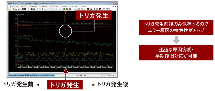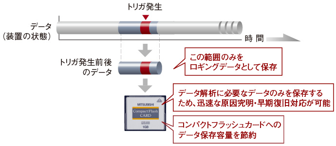 - エラーをトリガにしてエラーの原因となりうる要素をロギングできます。トリガ発生前後のデバイスデータのみを絞り込んで抽出できるので、迅速な原因究明・早期復旧作業に活用できます。また、コンパクトフラッシュの容量を節約できます。