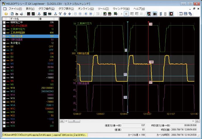 ウィザード形式によるアシスタントで簡単に設定できる『高速データロガーユニット設定ツール』や、収集したデータをトレンドグラフで表示しデータ解析などに役立つ、ロギングデータ表示・分析ツール『GX LogViewer』も用意しました。生産過程における様々なデータを蓄積することで、品質の向上、生産コストの削減はもとより、効率的な生産現場を構築するために必要なシステムの最適化に貢献します。