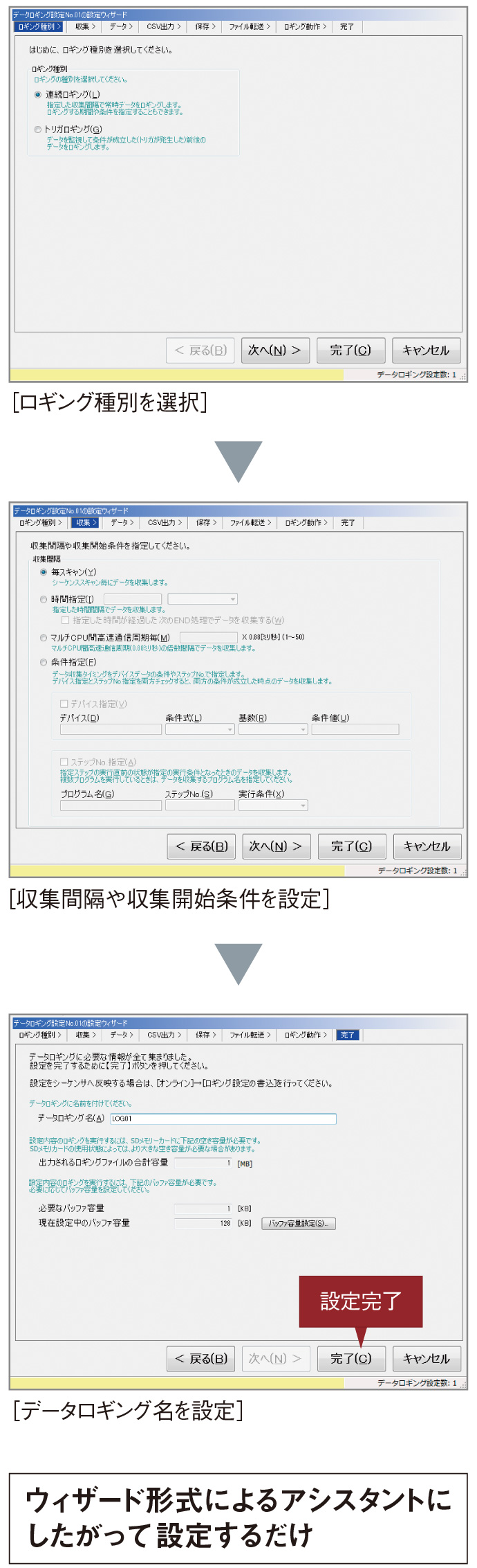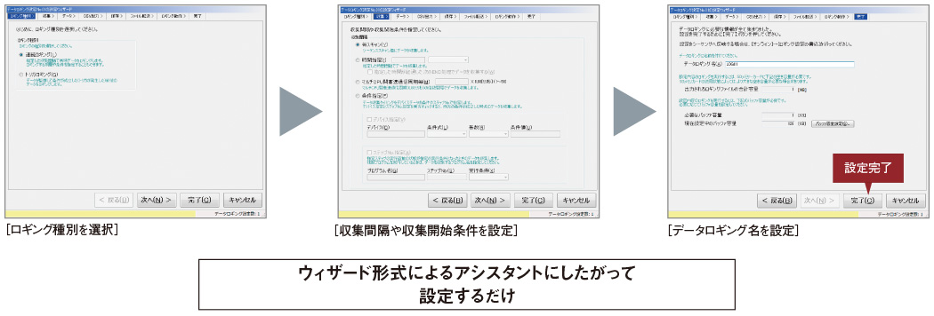 - 目的に応じたデータロギング方法を、ウィザード形式によるアシスタントで設定できますので、初めて使用する方でも迷わず簡単に設定できます。