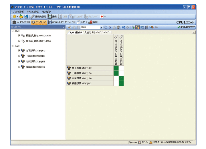 システム構成に合わせて、1台のCPUユニットにつき144点まで安全入出力点数が拡張できます。また、設定・ロジック作成などの作業を簡単に行える専用「設定・モニタツール」(無償)も用意しています。