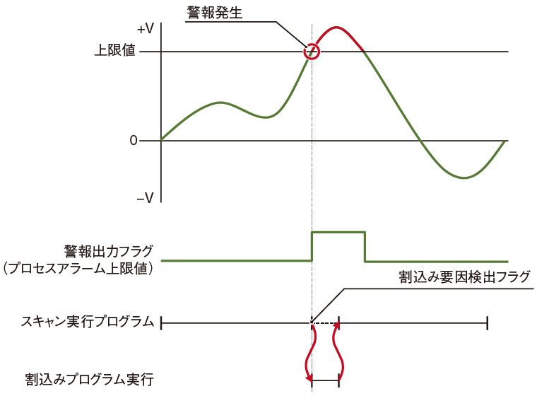 - 警報出力フラグの割込み機能強化により、プログラムのスキャンタイムに関わらず割込み処理が実行されるため、迅速に異常を検知できます