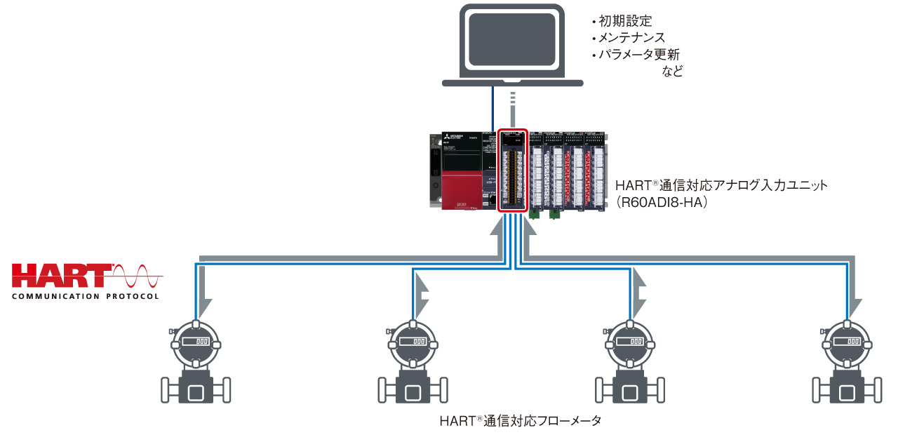 - HART®通信に対応したフィールド機器のパラメータなどを、HART®通信対応アナログ入力ユニットより遠隔設定できます