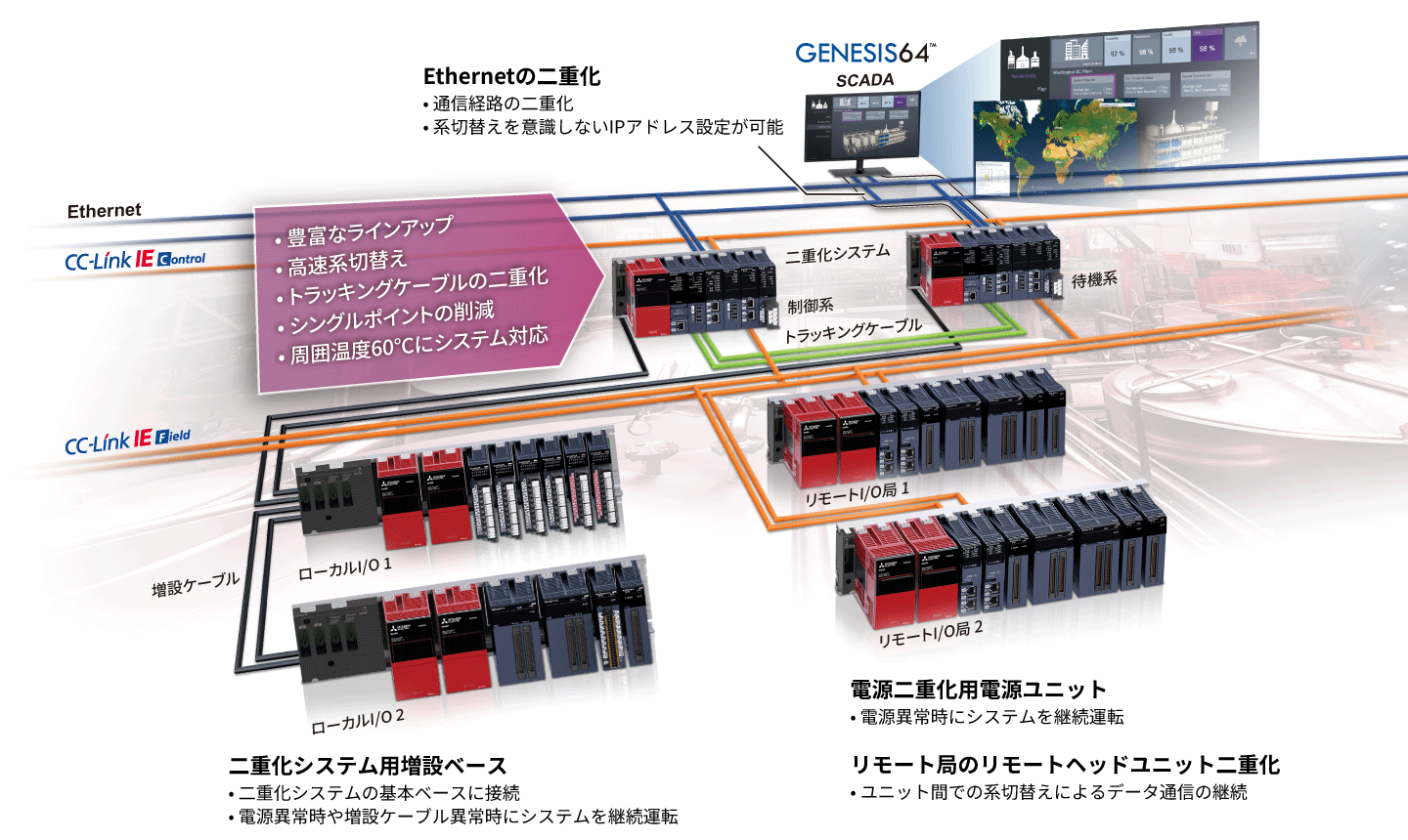 監視(SCADA)、コントローラ、ネットワーク、増設ケーブルの各階層でシングルポイントを削減し、従来に比べより高信頼なシステムが構築できます。専用システムのような信頼性が要求される特別なシステムへの適用を可能とします。