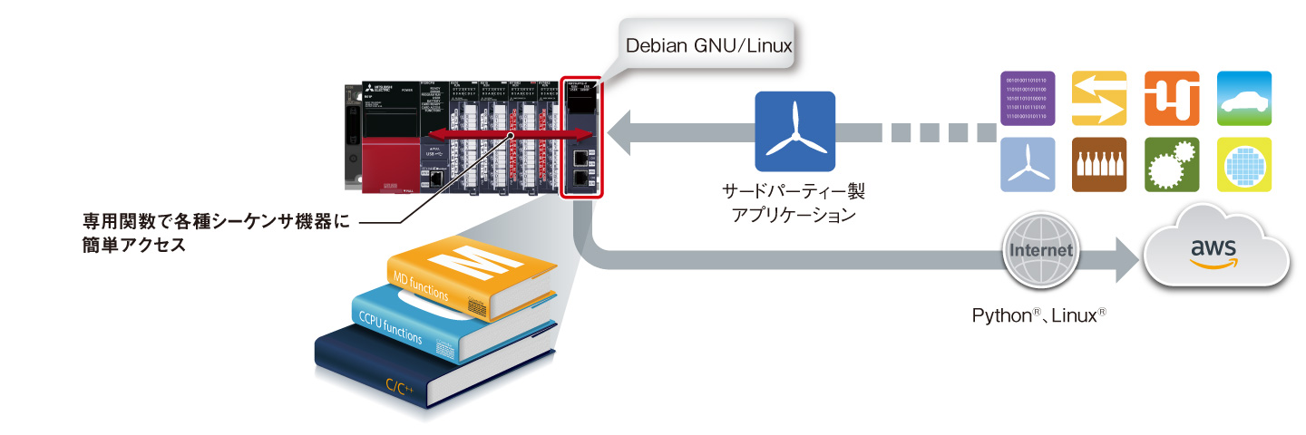 - 専用関数や通信ライブラリで簡単に各種シーケンサ機器にアクセスできます。また各種用途に応じたパートナーアプリケーションをご利用いただくことで、多様なシステムを構築できます