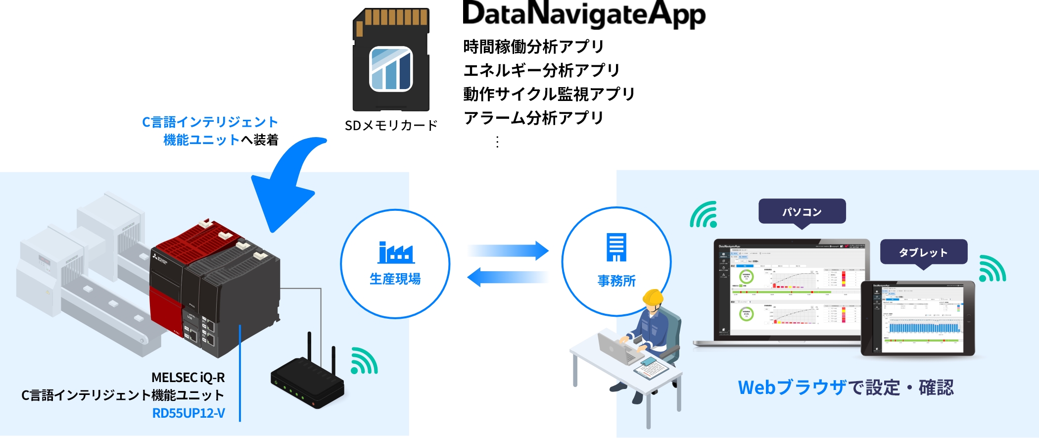 DataNavigateAppをSDメモリーカードにインストールし、そのSDメモリーカードをC言語インテリジェント機能ユニットに装着することで使用できます。