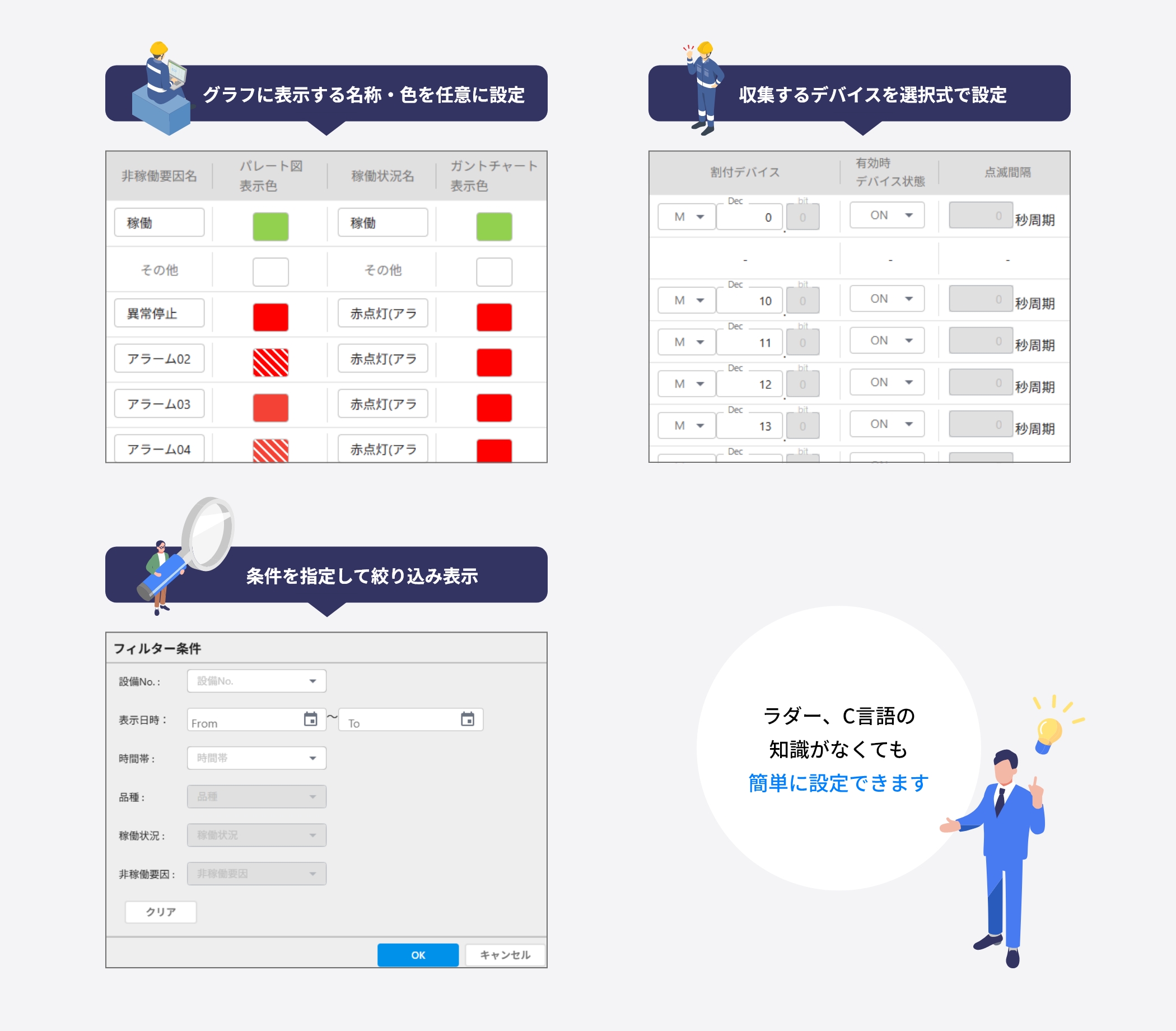 工場のIoT、DX化の第1歩である、生産現場レベルの「みえる化」(可視化、分析)を様々な機能で支援します。