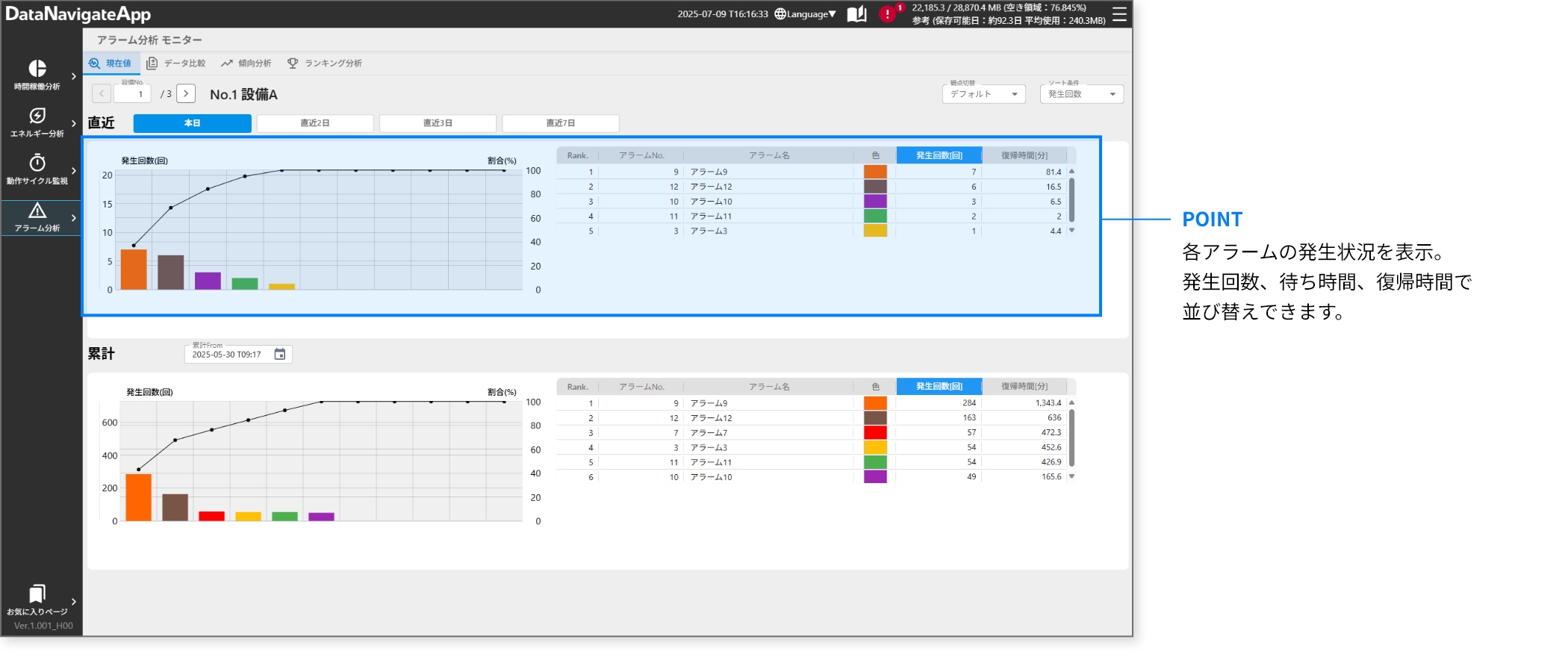 設備のアラームの発生状況(回数、時間)を可視化するアプリです。