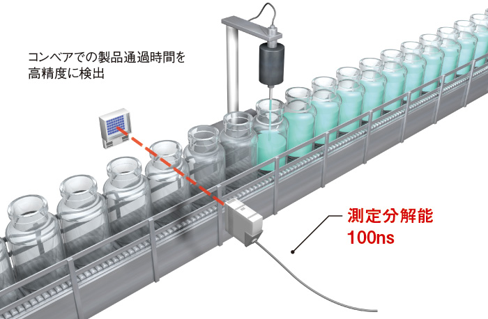 - 食品や飲料製品の製造時に、コンベア上を移動する瓶の大きさや速度を近接センサで簡単に測定できます