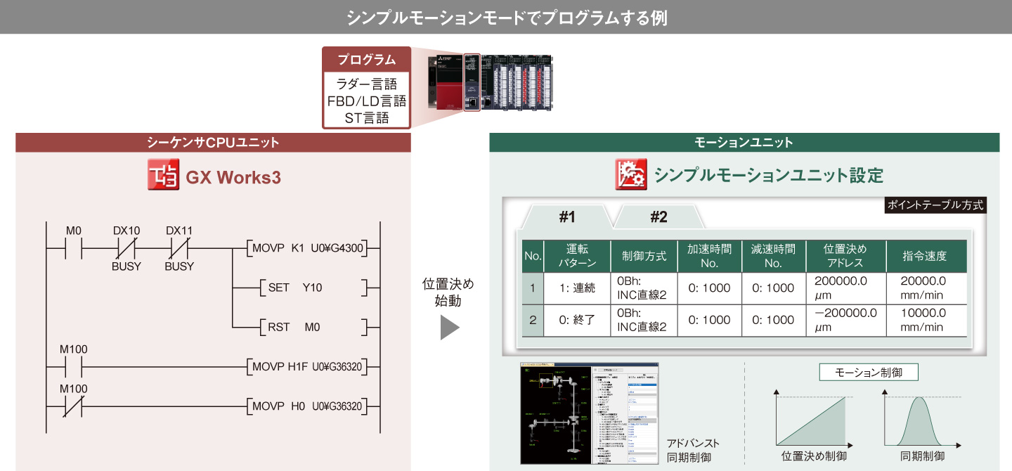 - モーションユニットでは、高速・高精度なモーション制御を行います。さらにST言語による演算処理もできるため、シーケンサCPUユニットとの負荷を分散できます