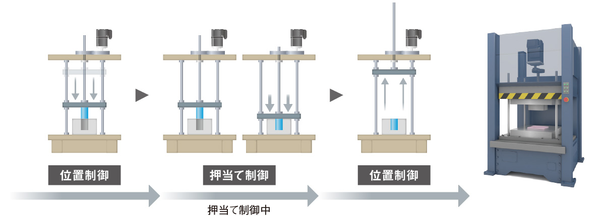 - サーボモータの停止や機械へのショックを与えることなく、位置制御から押当て制御に切り換えられます