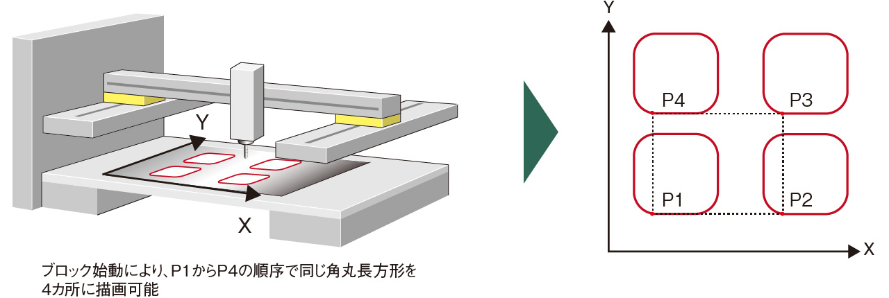 - 位置決めデータ群に複数軸同時始動、高速始動、順次実行するブロック始動などの位置決めデータ始動方法を組み合わせることで、ワークの移動に合わせて一連のモーション制御を実施できます