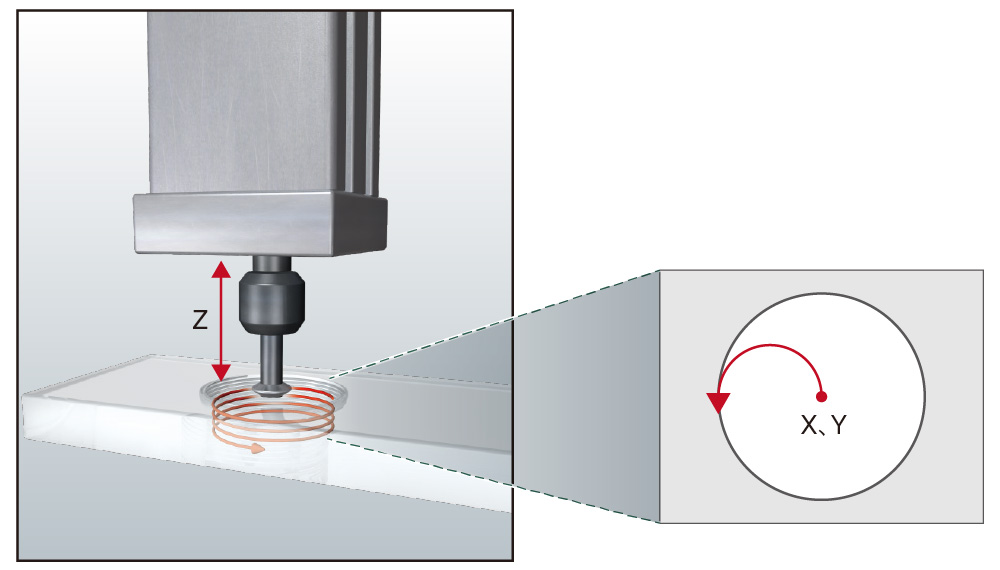 - 2軸円弧補間制御に直線補間軸(直線制御)が追従することで、螺旋の軌跡を描くヘリカル補間を実現します