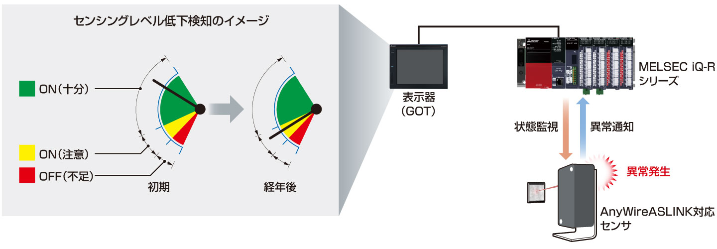 - センサのセンシングレベルを、シーケンサや表示器(GOT)から常に監視できます