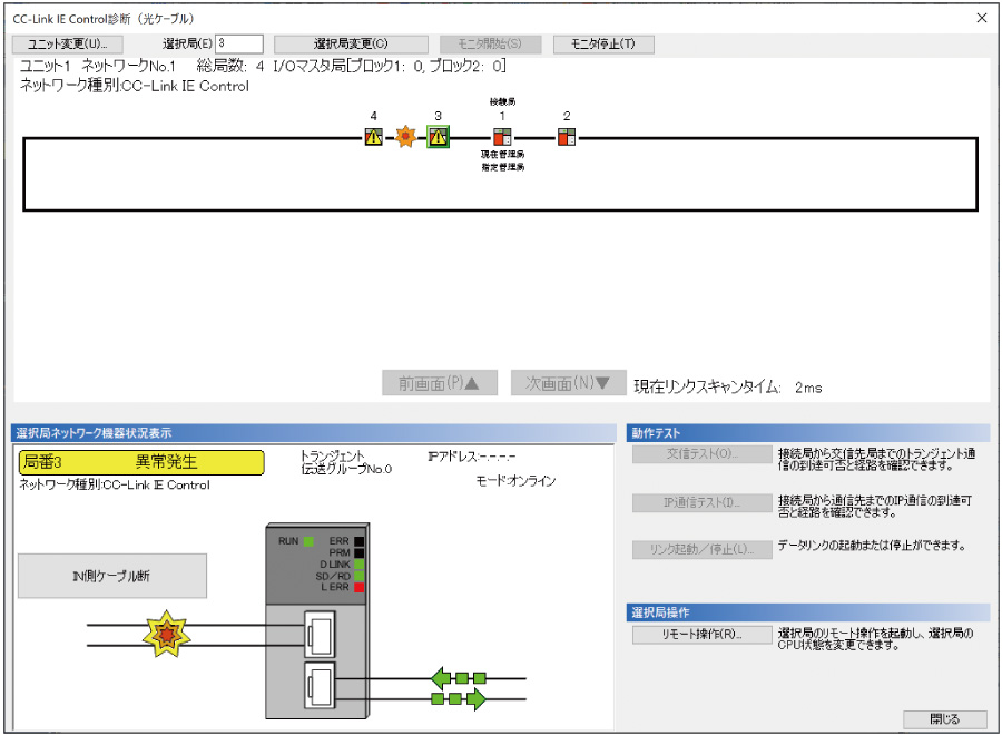 - エンジニアリングソフトウェアGX Works3で、CC-Link IEコントローラネットワーク全体の状況を見える化し、回線トラブル、ユニットの異常をすぐに発見できます