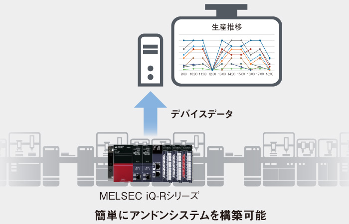 - 収集したシーケンサ内のデバイスデータをExcel®で加工し、簡単にアンドンシステムを構築できます