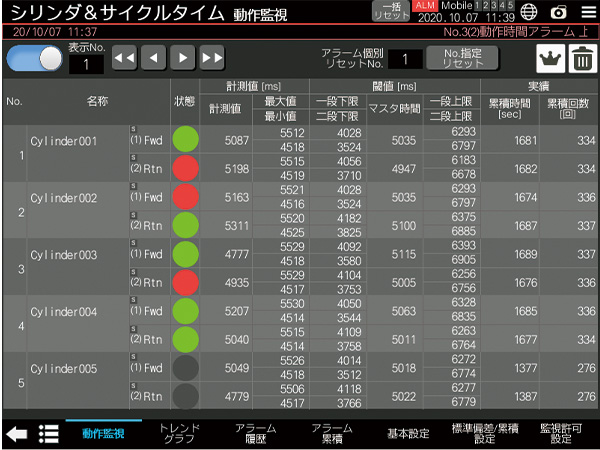 シリンダーの状態や動作、設備の稼働サイクルを計測・モニタし、異常兆候を監視します。*1
