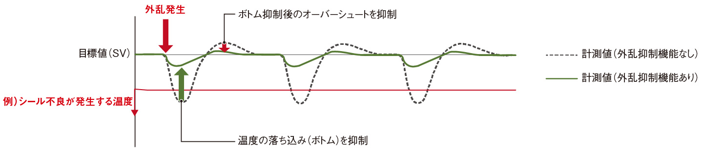 - 外乱抑制機能により外乱で生じる温度変動を素早く減衰できるため、規定温度内で製品加工ができ、不具合製品の発生率を削減できます