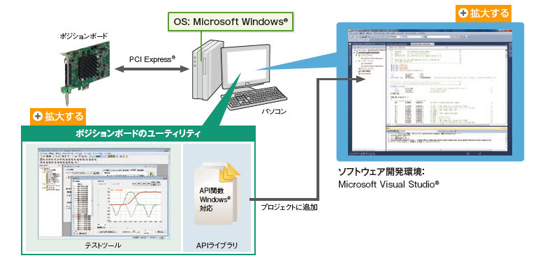 ユーザプログラムからPCI Express®経由で、C言語コントローラインタフェースユニット/ポジションボードにアクセスするためのソフトウェアです。お客様にてデバイスドライバを準備する必要はありません。
