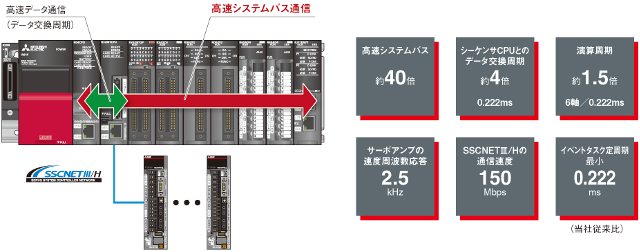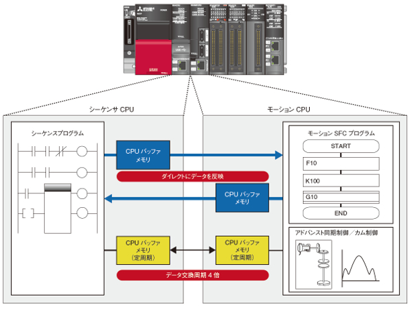 シーケンサCPUとモーションCPU間を0.222msごとにデータを転送することができます。CPUバッファメモリ(定周期通信エリア)はモーション制御に同期しており、制御の無駄な時間を削減することができます。