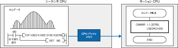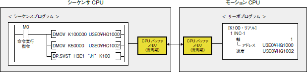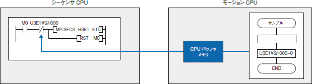 シーケンサCPUとモーションCPU間にCPUバッファメモリがあり、2種類の用途に使用することができます。